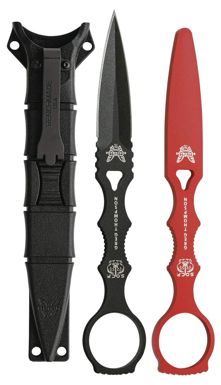 The 176 SOCP skeletonized dagger and red trainer combo is the optimal tool for self-defense and allows the user to maintain dexterity and manipulate other objects without putting down the knife. The specialized sheath design also integrates into gear and webbing while keeping a low profile. MOLLE® compatible. Made in USA.