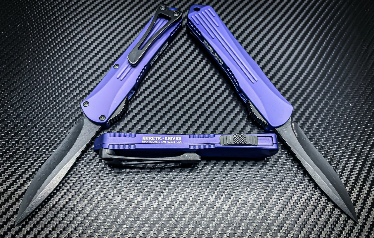 The Heretic Knives Manticore-S is the little brother to the Manticore-X line. It features a contoured aluminum chassis with jimping all along the sides. This lightweight and capable OTF knife opens and closes smoothly, making for an excellent everyday carry. Comes with a ball-bearing glass breaker and a deep carry pocket clip.