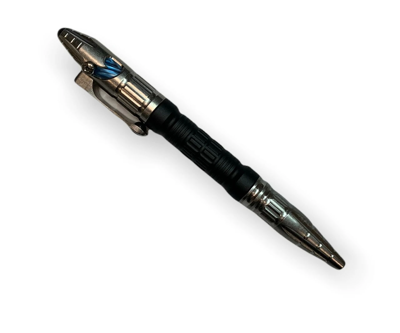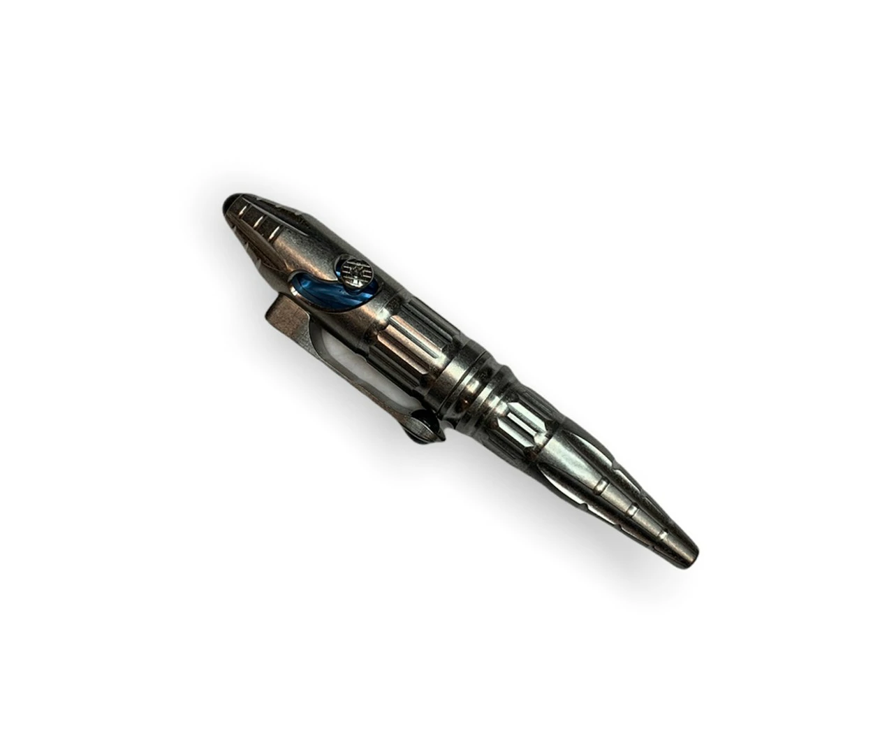 This model features stonewash finished titanium tail and end cap with a black anodized aluminum barrel. Blue anodized titanium bolt. Stonewash finished titanium rollerball pocket clip. Replaceable black ink cartridge. Brand new in box.