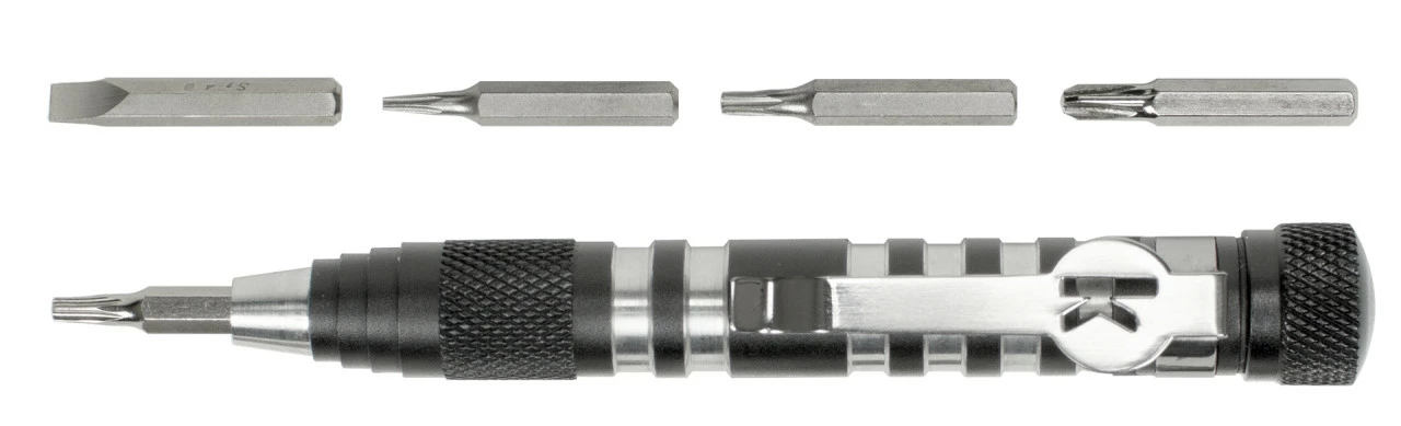 This is the right tool for adjusting your Kershaws. Switch a pocketclip, tighten a screw, or adjust the pivot tension with the TX-Tool. It includes five key bits for adjusting your Kershaws: T6, T8, T10, and a #2 Phillips® for most Kershaws, plus a slotted screwdriver bit for the pivot of the Kershaw–Emersons. A magnetic bit driver tip makes it easy to change bits.