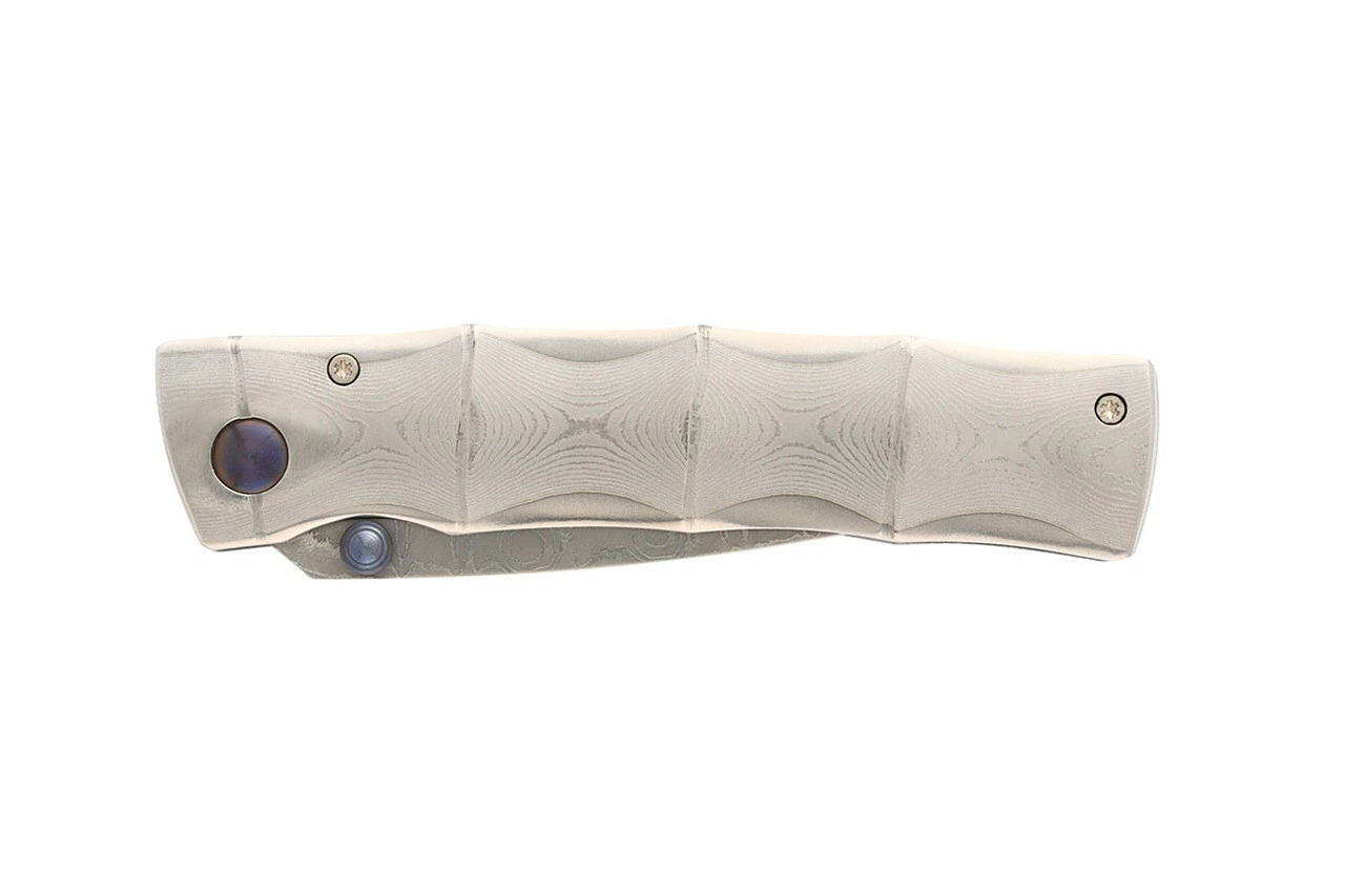 Made in Seki, Japan, Mcusta combines modern technology with traditional Japanese craftsmanship to produce hand finished custom quality production knives. This knife measures 3.75″ long closed and features a 33 layer damascus stainless steel blade with VG-10 core and Damascus handle shaped as bamboo with Stainless liners. Comes with elegant Japanese nishijin pouch.