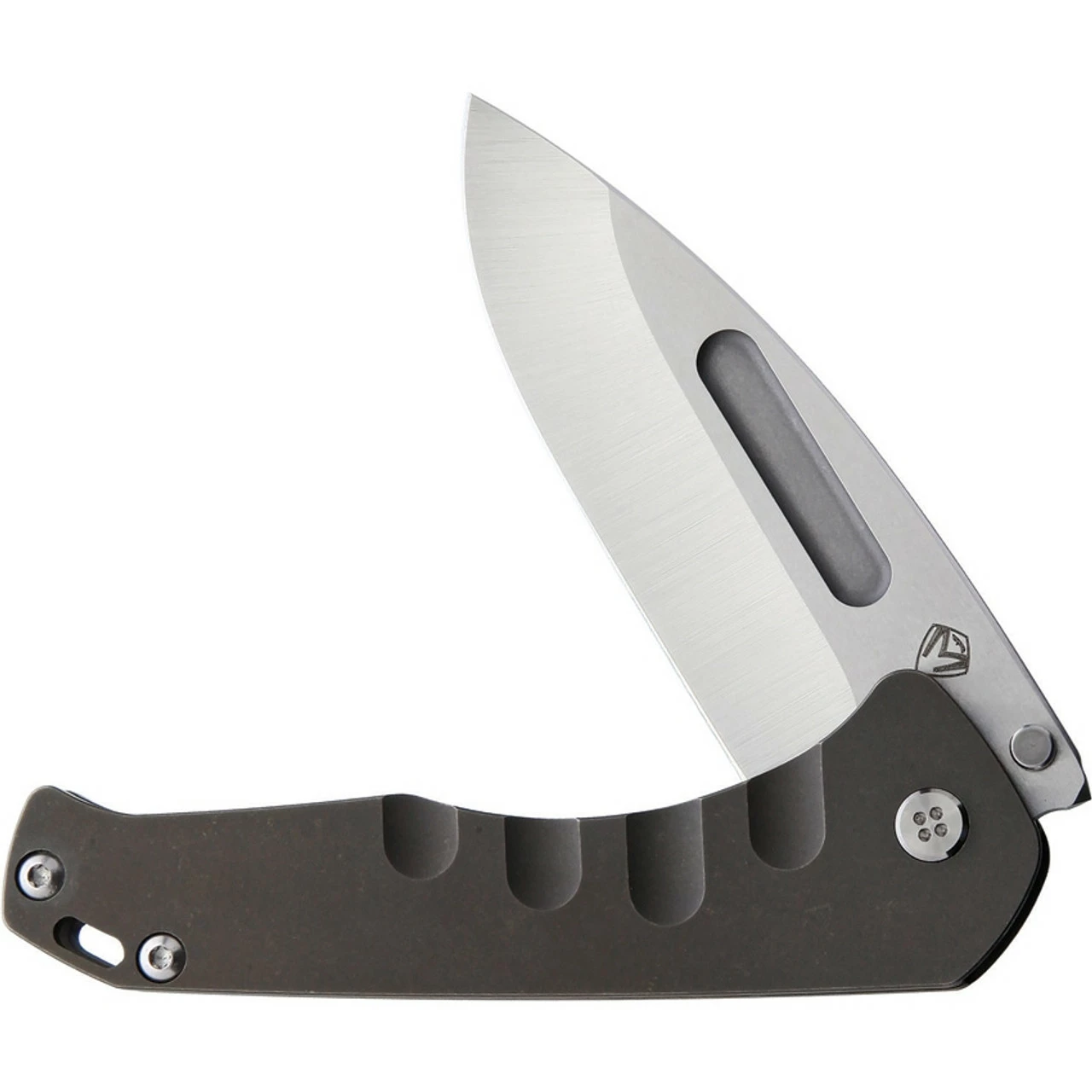 4.38″ (11.13cm) closed. 3.25″ (8.26cm) tumbled finish S35VN stainless drop point blade. Bronze anodized titanium handle. Lanyard hole. Pocket clip. Water tight case. Boxed.