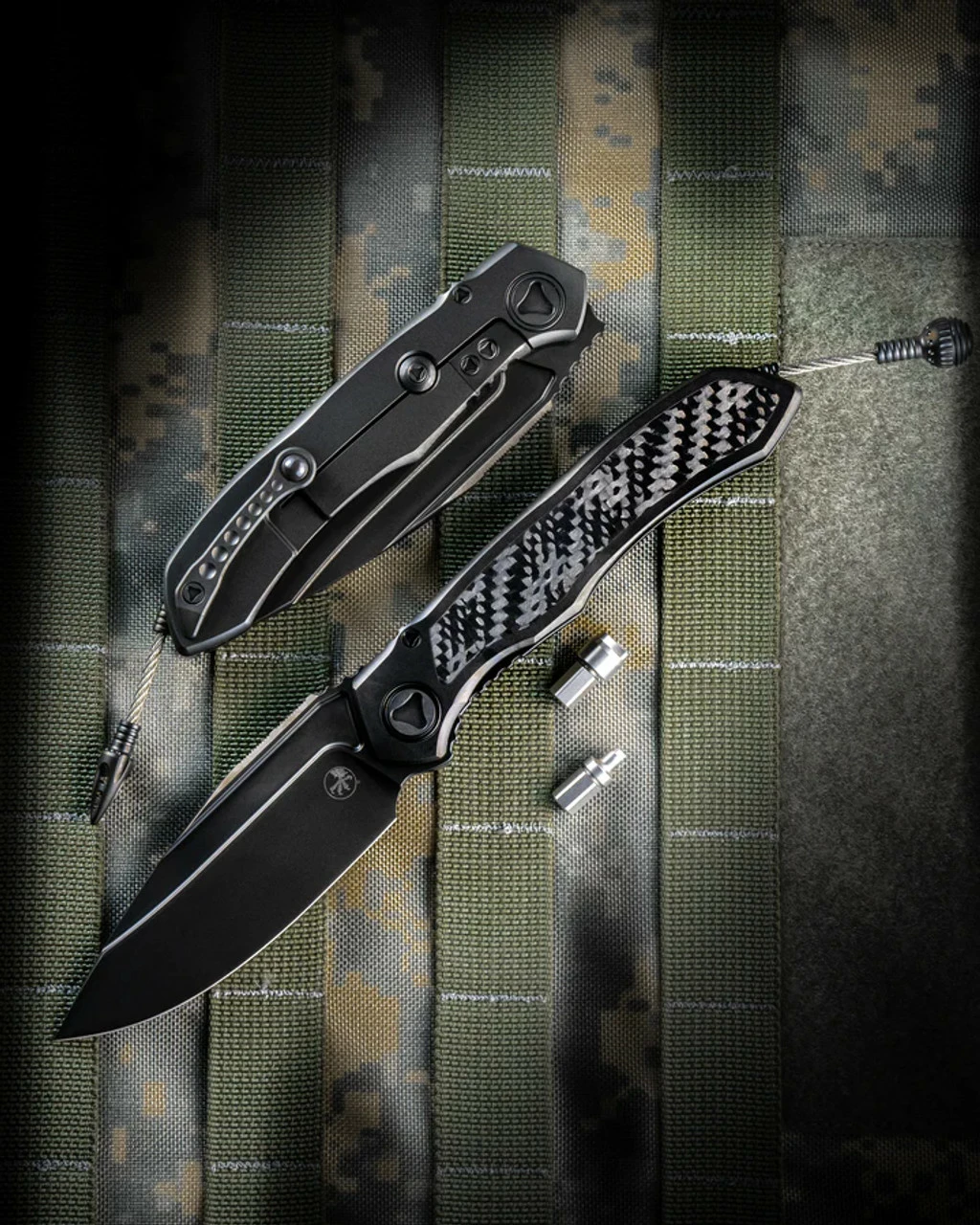 6AL-4V Titanium Handle, Carbon Fiber Inlay, Single Edge Drop Point or Tanto Blade, Blue or Bronzed Pivot Collar and Overtravel Stop, 32 Silicon Nitride Ball Race Bearing System, Proprietary Screws, Interchangeable Lanyards, Pocket Clip, Set of Bits
