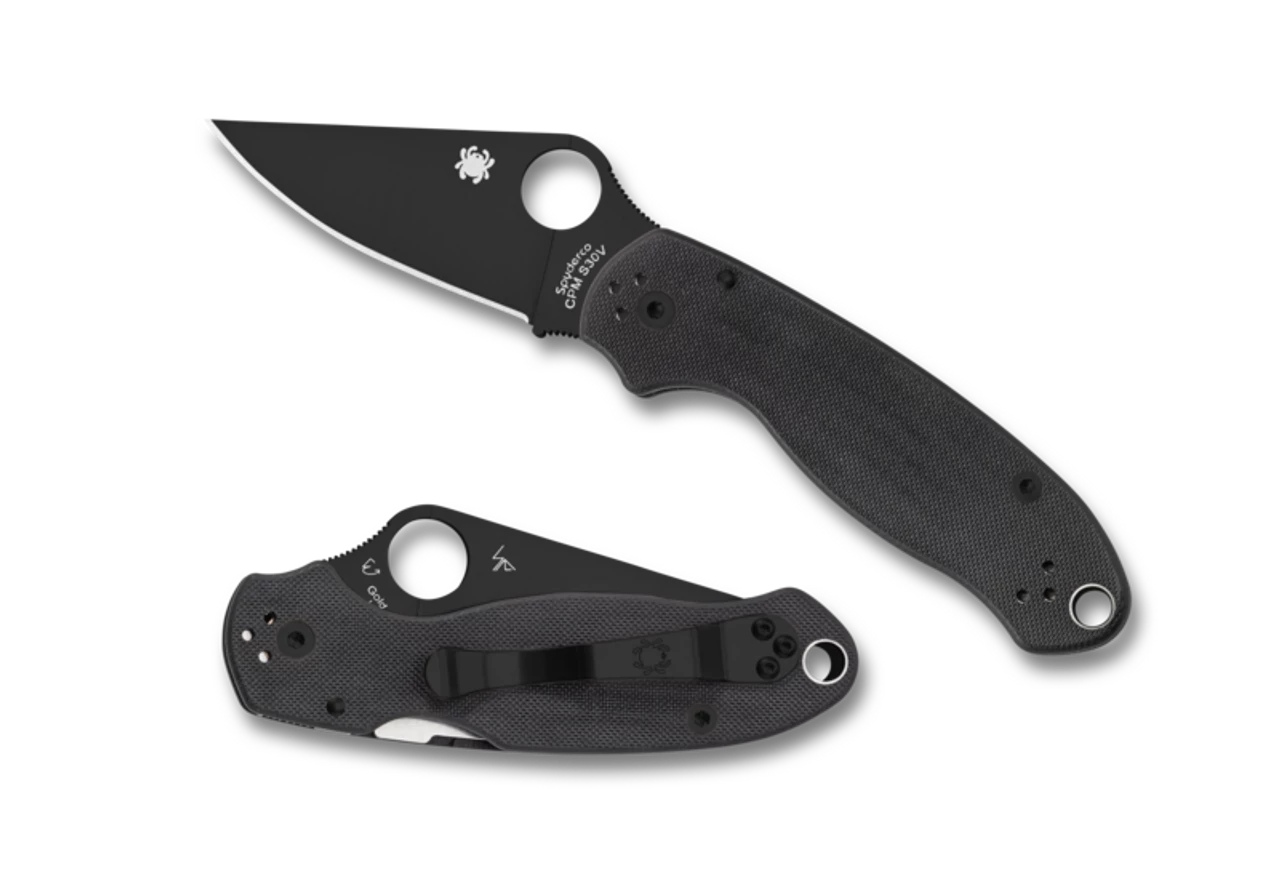 The Para 3 folding knife packs all the time-tested features and functionality of Spyderco’s iconic Para Military™ 2 into a smaller, easier-to-carry format. For tactical end users who are concerned about light discipline or those who just prefer the look of a black blade, the Para 3 is now available with a tough Diamond Like Carbon (DLC) blade coating. This low-profile coating is permanently bonded to the premium CPM® S30V® stainless steel blade, which features a full-flat grind, a PlainEdge™ cutting edge, and a fully accessible Trademark Round Hole™ for swift, ambidextrous, one-handed opening. The blade is supported by a high-strength Compression Lock® mechanism nested within the handle’s textured black G-10 scales. Its easy-to-clean, open-backed handle construction reduces the knife’s weight, while providing a solid platform for a four-position hourglass clip that supports left and right-side tip-up or tip-down carry. Like the blade, the clip and all assembly screws are blackened with non-reflective coatings.