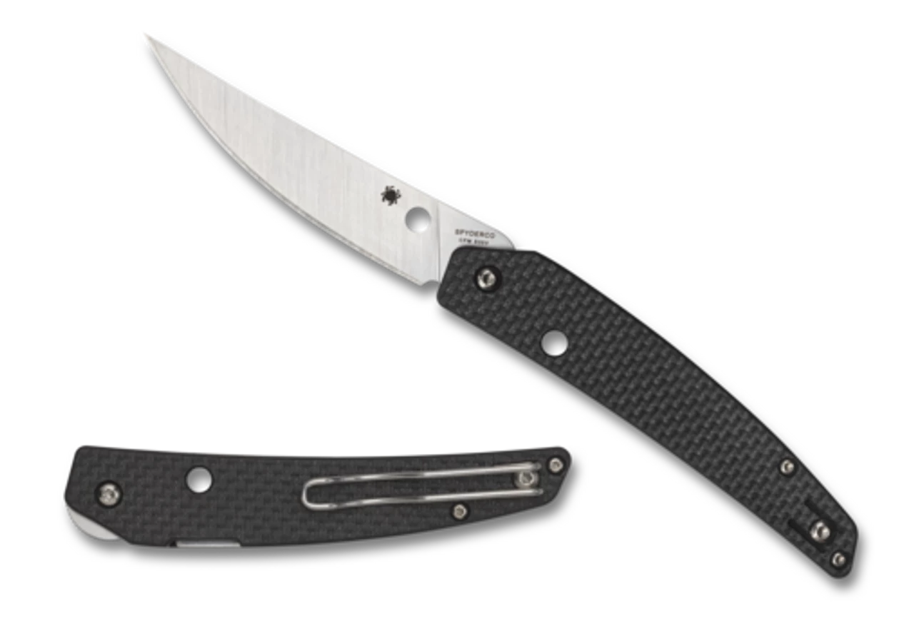 The ultra-slim Spyderco Ikuchi is a radically different approach to pocketknife form and function. Designed by Paul Alexander, a Ph.D. in Mechanical Engineering and a lifelong knife enthusiast, the Ikuchi (pronounced ee-koo-chee and named after a mythical Japanese sea monster) has an elegantly curved handle crafted with full, skeletonized stainless steel liners and stunning carbon fiber/G-10 laminate scales.