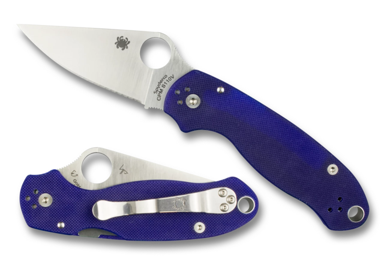 This elite version of the Para 3 supercharges the performance of this compact design with state-of-the-art CPM® S110V® blade steel. In its basic form, the Para 3 distills all the best-in-class features and benefits of the iconic Para Military™ 2 into a smaller, more pocket-friendly format. When enhanced with CPM S110V, its full-flat-ground PlainEdge™ blade achieves even higher levels of wear resistance and corrosion resistance—qualities that optimize its performance as a cutting tool. CPM S110V’s high carbon content, advanced alloy mix, and high volume of vanadium and niobium carbides significantly increase the steel’s edge-holding properties as compared to other particle metallurgy steels. This extreme edge retention complements the Para 3’s many other distinguishing features—exceptional ergonomics, a high-strength Compression Lock® mechanism, and versatile four-position pocket clip—to make it one of the most capable production folding knives available today. To make it even more special, this remarkable expression of the Para 3 proudly wears textured G-10 handle scales in the deep midnight blue color that is a signature of Spyderco’s CPM S110V breed.