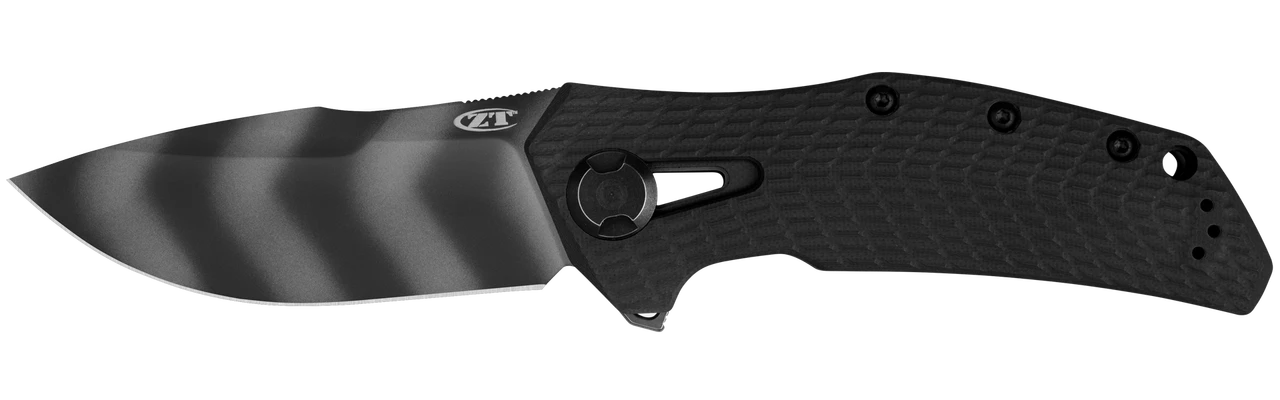 For the first time ever, ZT is using a black-oxide BlackWash finish with its classic tiger stripe pattern. The 0308BLKTS offers a beefy 3.7-inch tiger stripe blade with premium CPM 20CV blade steel. The handle features black G10 on the front scale with a titanium back. Both the front and back are heavily 3D machined for an ultra-secure grip. The 7/32-inch solid pivot features a custom nut that enables it to be adjusted in the field with a 1/2-inch wrench. The pocketclip hole pattern is compatible with many after-market clips.